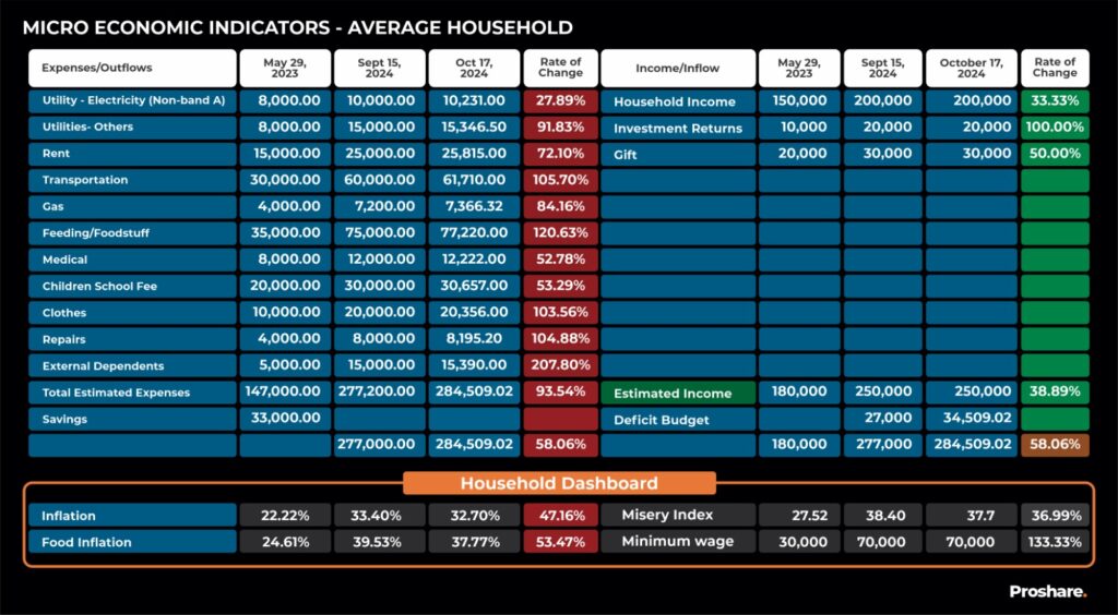 For instance, a hypothetical household with a salary of N70,000 or above has basic expenses, including rent, transportation, feeding, and utilities, which have risen significantly, with rates of change ranging between 50 and over 200% since May 2023. The increase has led to a budget deficit that has steadily grown, yet interest rates remain elevated at over 30% as of October 2024, further compounding the household woes